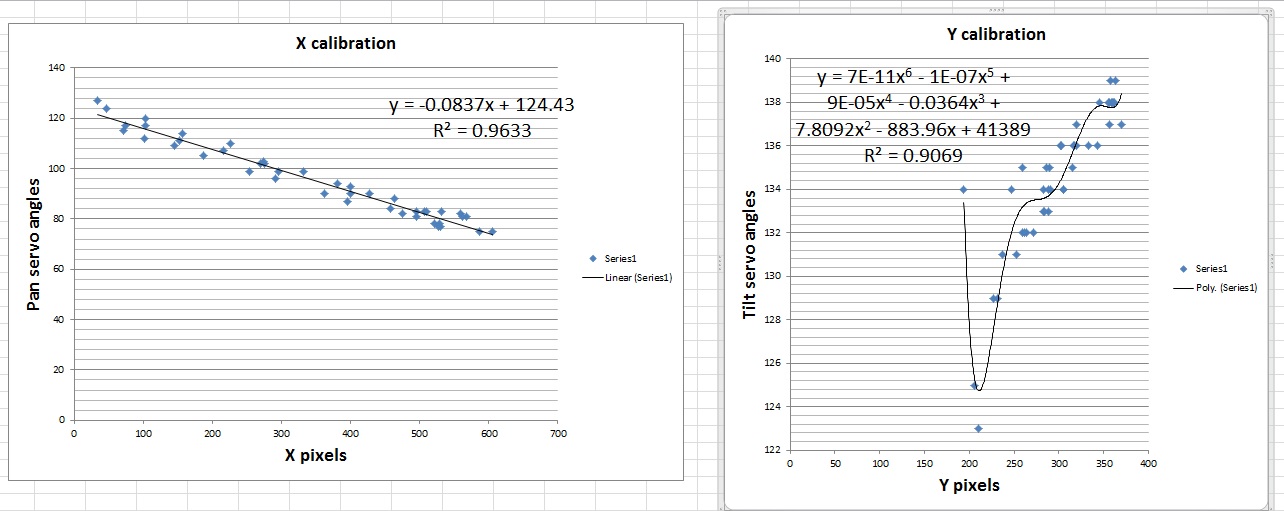 The following figures shows my measurements in Excel and graphs between the gun angles and the CoM position in pixel coordinates.